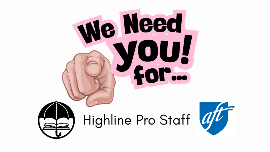 It’s important that our bargaining committee is a large, diverse, and representative group of Exempt Staff employees all across Highline. Please reply to this email with any questions you have, even if you are not ready to join the committee, your help and your voice are needed and wanted. AFT offered bargaining training in January, if you would like to look at the slide information click on this link. In solidarity,